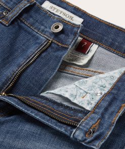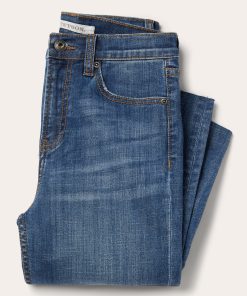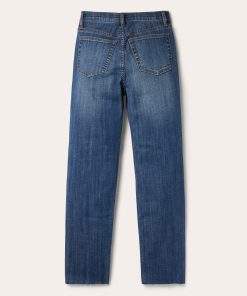 These 915 High Rise Straight Fit Crop jeans are crafted from cotton denim with just enough stretch for comfort and a medium blue rinse. They have a contour waistband that sits just below the waist, 5-pocket style, and a raw edge hem that is cropped to the ankle. The plain back pockets are finished with Stetson branded buttons, rivets, and zipper, and the jeans are finished with gentle sanding and whisker details for a lived-in look.
