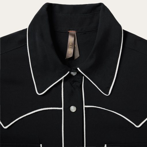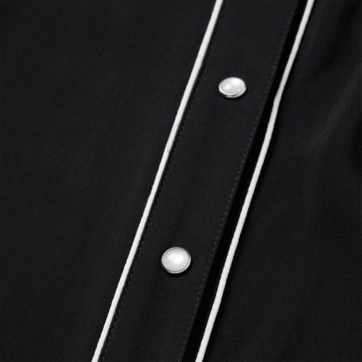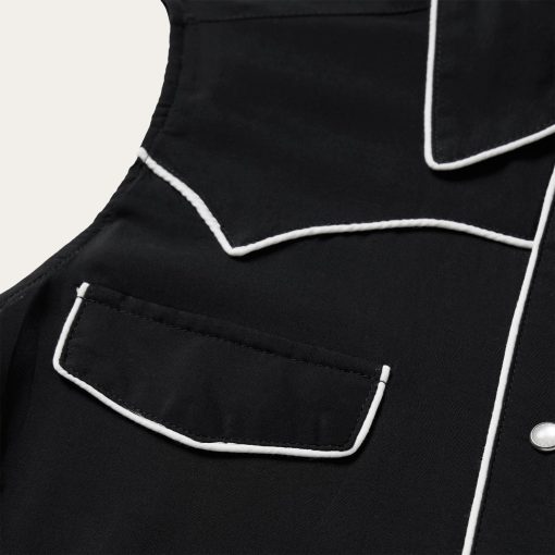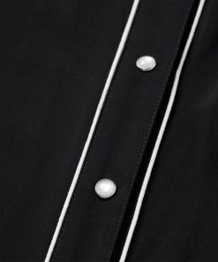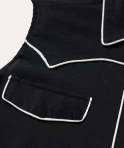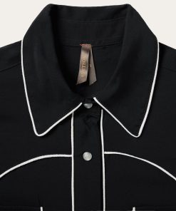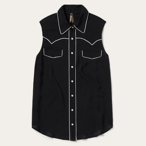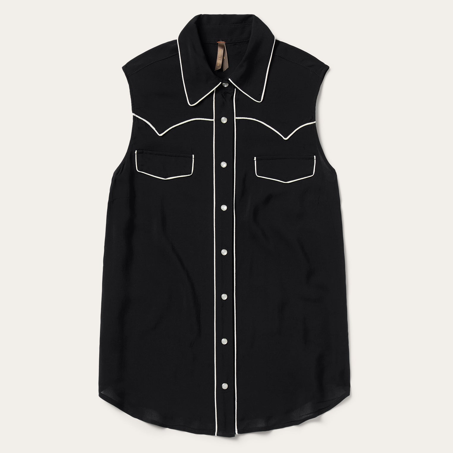 This black sleeveless western shirt is crafted from soft 100% rayon and features eye-catching cream contrast piping and embroidered detail. It has single point curved front and back yokes, front faux pocket flaps and a full snap front. Cut in a stylish, flattering boyfriend fit, which allows for comfort and freedom of movement.