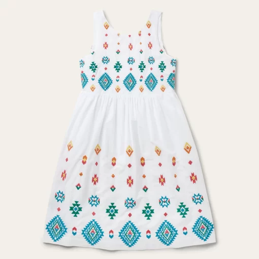 Colorful, lightweight and versatile, this white cotton lawn dress is embroidered with our vibrant red, yellow and turquoise Bright Schiffli design. It has an empire waist and large V back with a button strap closure. Darts at the bust provide a more custom-like fit, while the gathered skirt hits below the knees for a timeless silhouette. Made with smooth 100% high-quality white cotton lawn fabric, this lightweight, Western-inspired dress is ideal for any warm-weather gathering.