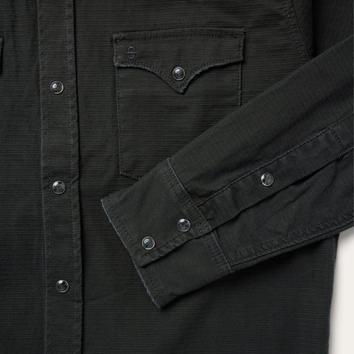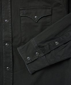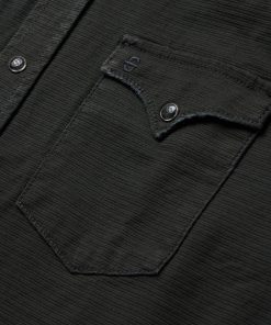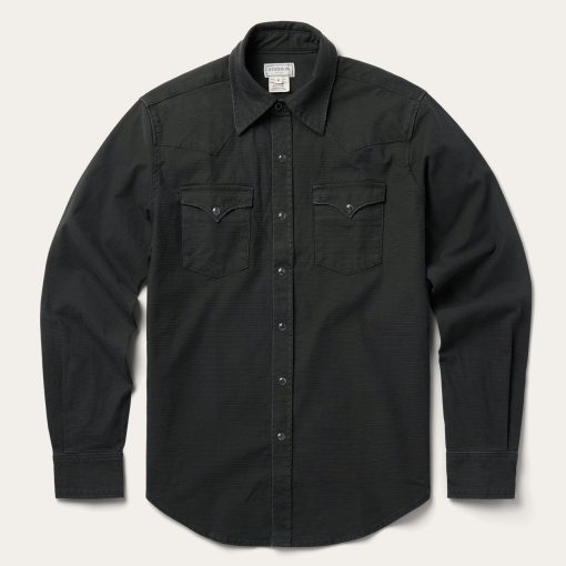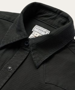 This charcoal grey corded denim shirt is crafted from yarn-dyed 100% cotton denim. It features a one point curved back yoke, the Stetson “S” embossed on the front left pocket, and “STETSON” embossed on the right sleeve placket. The classic snap front features variegated logo snaps, while the three snap cuff offers a secure fit. Cut trim for a modern fit.