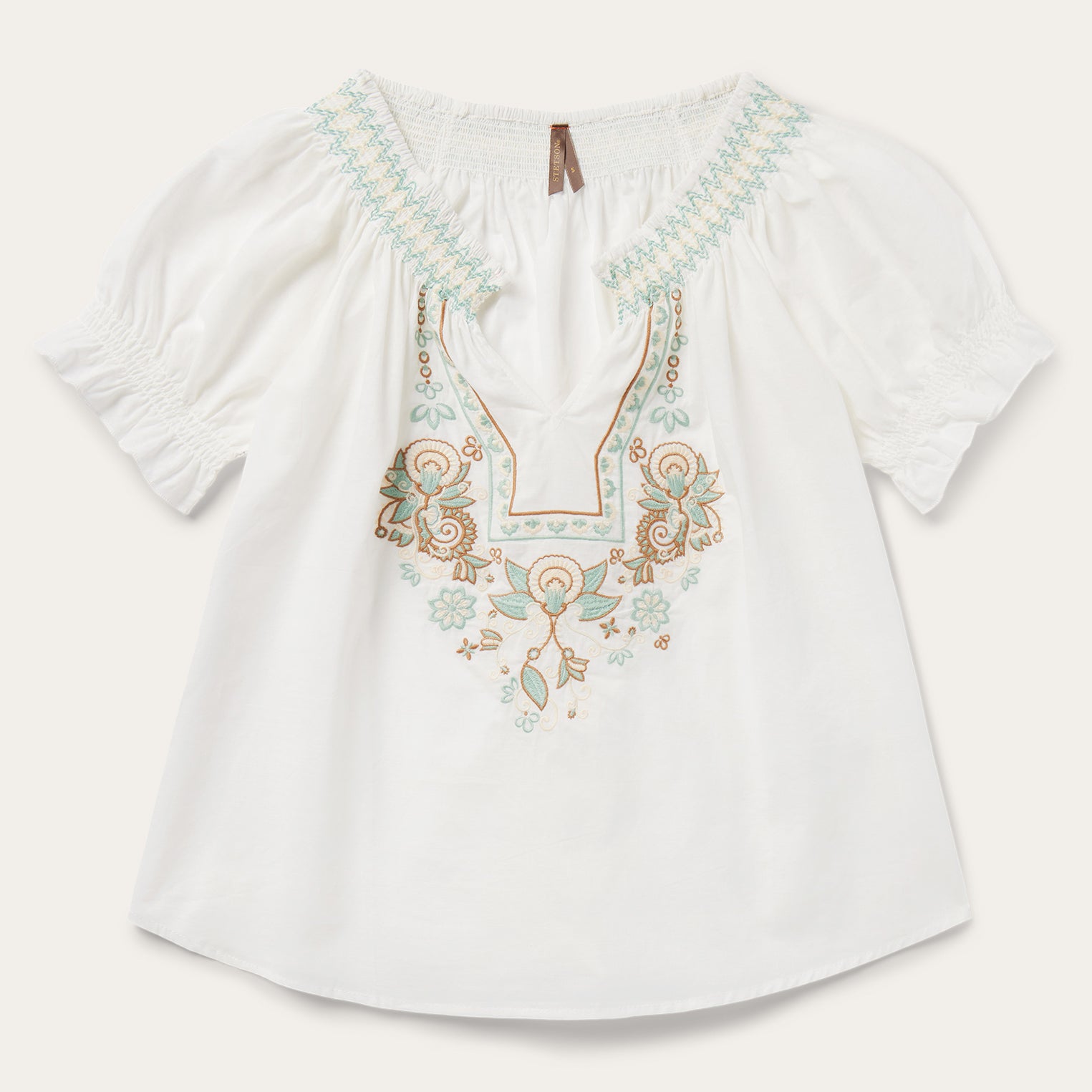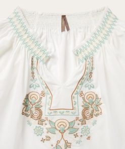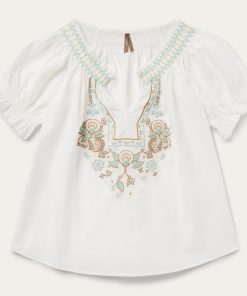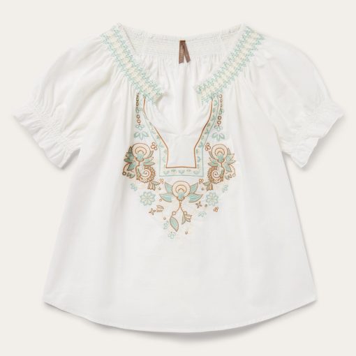 This short-sleeved pullover peasant blouse features an intricate floral embroidered detail. Crafted of 100% cotton voile which has a soft feel and a flowing appearance, the blouse has an easy, flattering drape that allows for all-day comfort and freedom of movement.