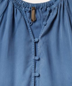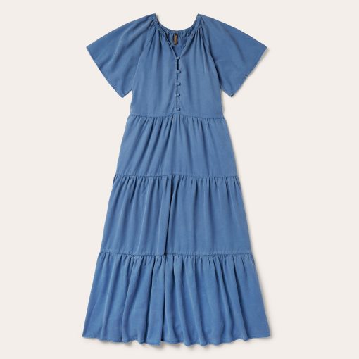 This Western-inspired dress is crafted from soft, durable 100% lyocell denim. It features flutter sleeves, an elastic neckline, and a full self-covered button bodice to the waist. The three tiered ruffle skirt provides a timeless, flowing silhouette, while the just below-the-knee length allows plenty of room for Western boots.