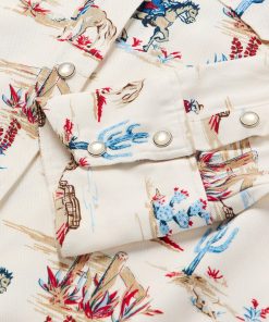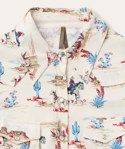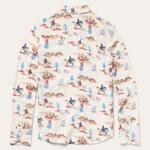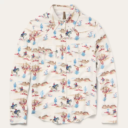 This stylish shirt is crafted from high-quality 100% rayon twill, which has a smooth, silky feel and features our western-inspired Desert Trail print. It has single point front and slightly curved back yokes, offset point chest patch pockets with snap closures, a full snap front and two snap cuffs.Cut with an easy, flattering drape, the dress allows for all-day comfort and freedom of movement.