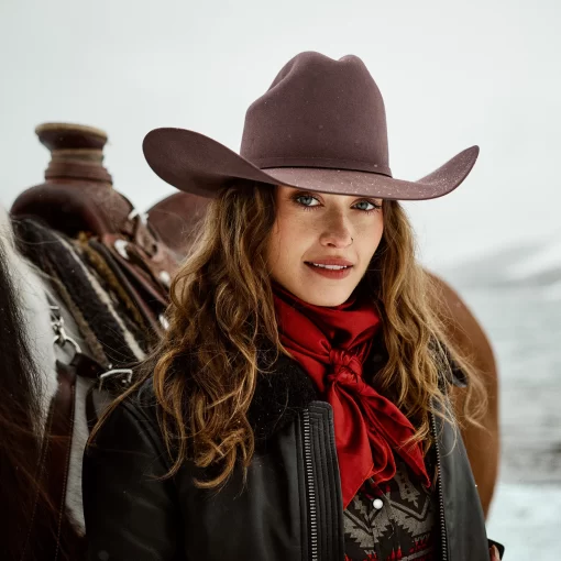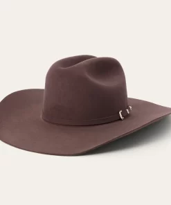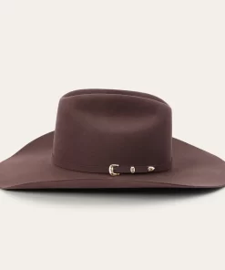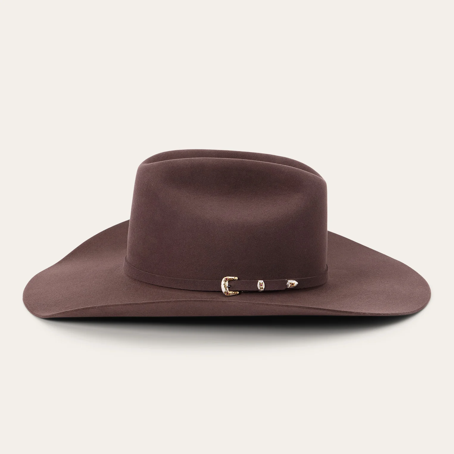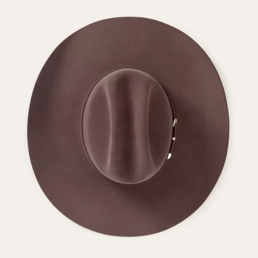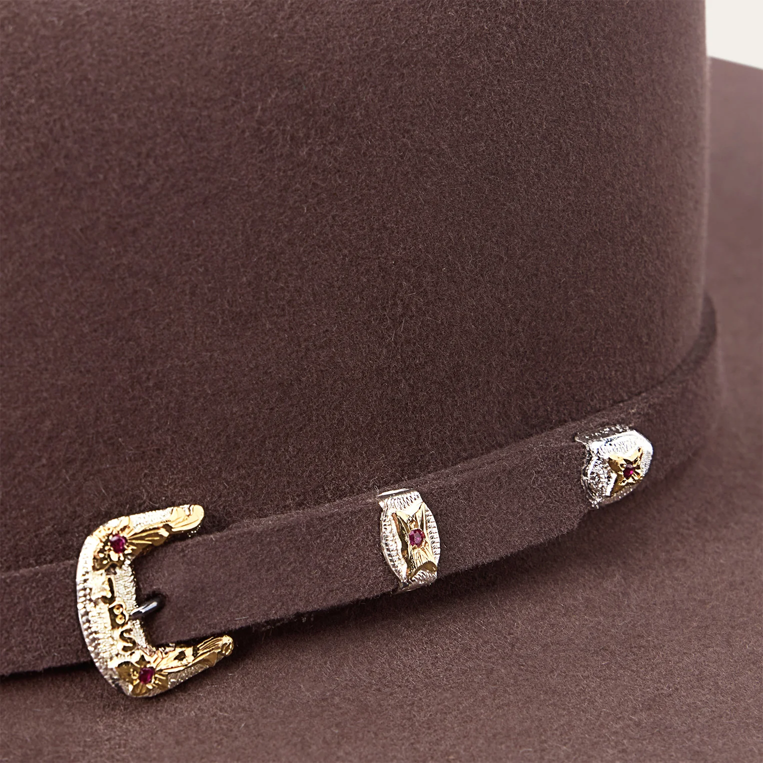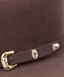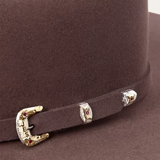 A true Stetson icon, our El Patron combines premier quality and classic western style in one timeless package. It’s crafted from our proprietary 30X fur felt, which is prized for its durability and elegant feel, and, as with all hats that come out of our factory in Texas, each El Patron is touched by more than 100 sets of hands during production, resulting in a hat that is designed and built to stand the test of time. This edition features a 9142 profile, which translates to a 4 5/8” cattleman crown and 4 1/4” brim. It’s finished with a matching self-felt band and three-piece, genuine sterling silver buckle with ruby-tone inset stones, gold overlay and JBS letters—a nod to our founder John B. Stetson, whose trailblazing spirit and commitment to quality live on in everything we make. A handsewn premier roan leather sweatband and deluxe embroidered satin liner provide a time-tested fit and premium comfort.