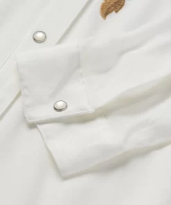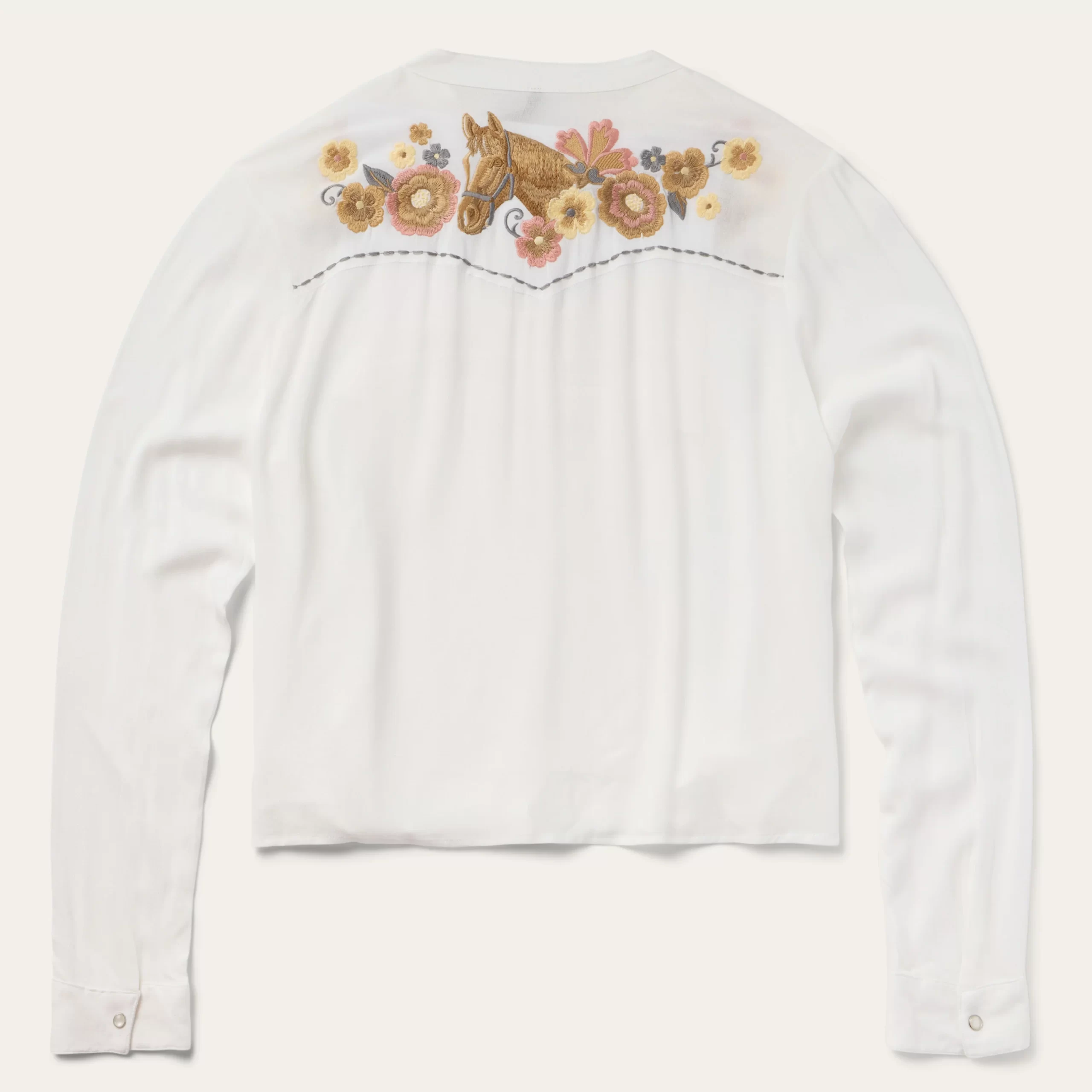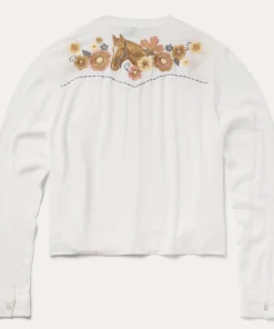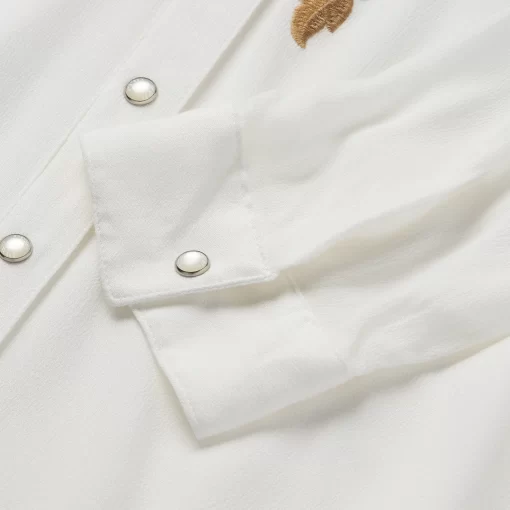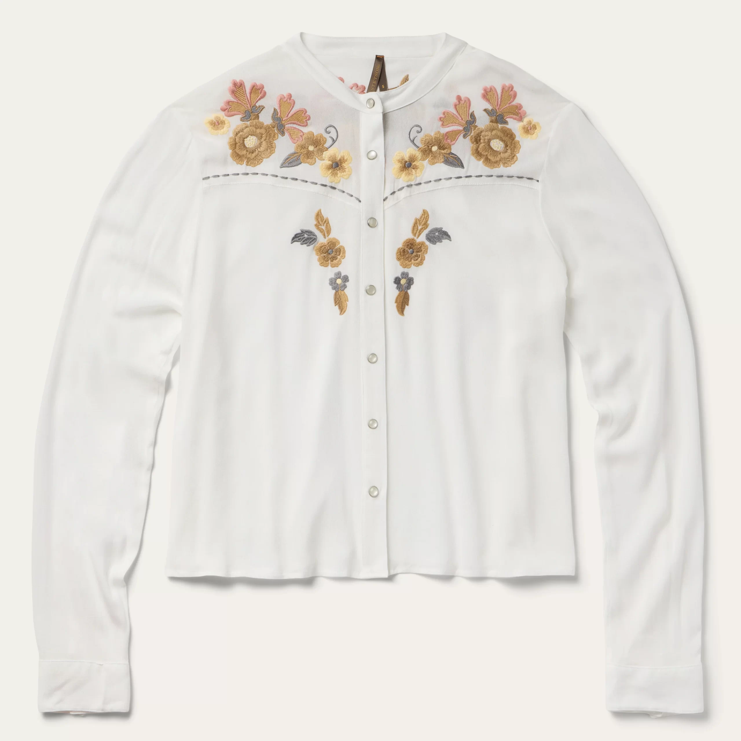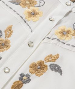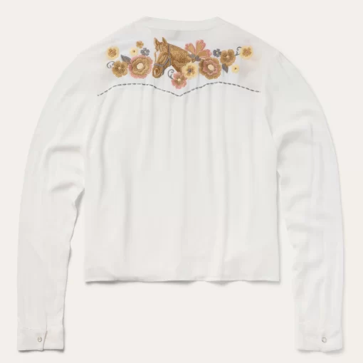 This stylish long-sleeve western shirt is crafted from 100% crepe rayon, which has a soft, fluid feel and features eye-catching floral embroidery. It has a stand collar, angled front yokes and single point back yoke, Cut with an easy, flattering drape that allows for all-day comfort and freedom of movement.