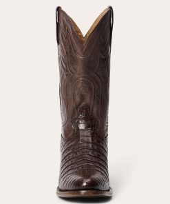 The Holliday Caiman Boot combines a traditional western silhouette with statement-making exotic materials. It features a genuine caiman vamp and a 13” leather corded shaft and features an R toe—a classic all-purpose style that also dresses up well—as well as a stacked leather cowboy heel. Its quality construction includes 3⁄4 welt soles, brass nails and handmade lemonwood pegs that will expand and contract with any moisture the boot may encounter. Premium leather lining and a removable Tru-X insole ensure comfort in every step.