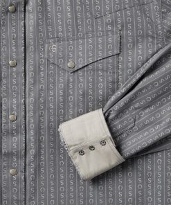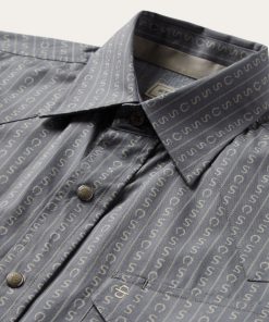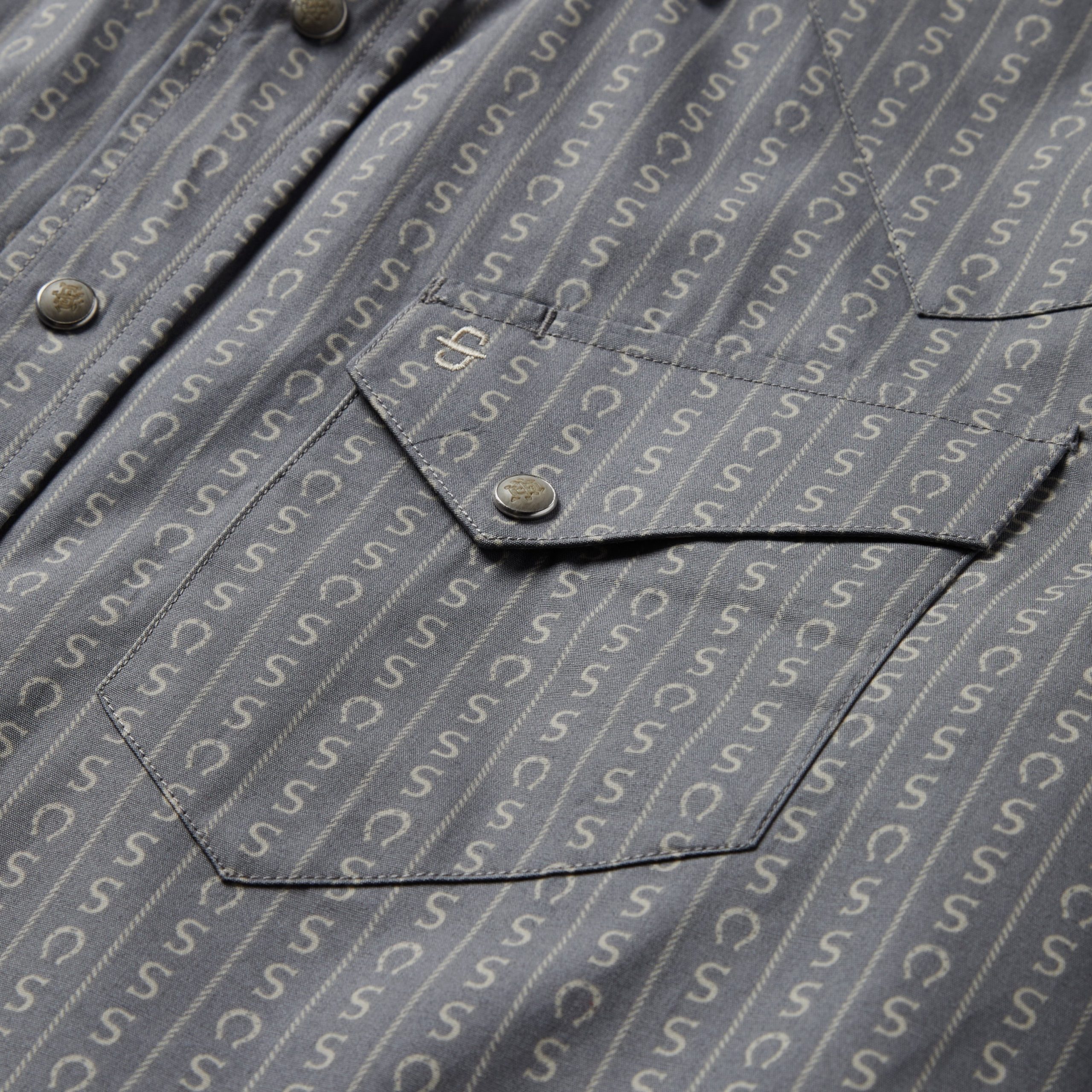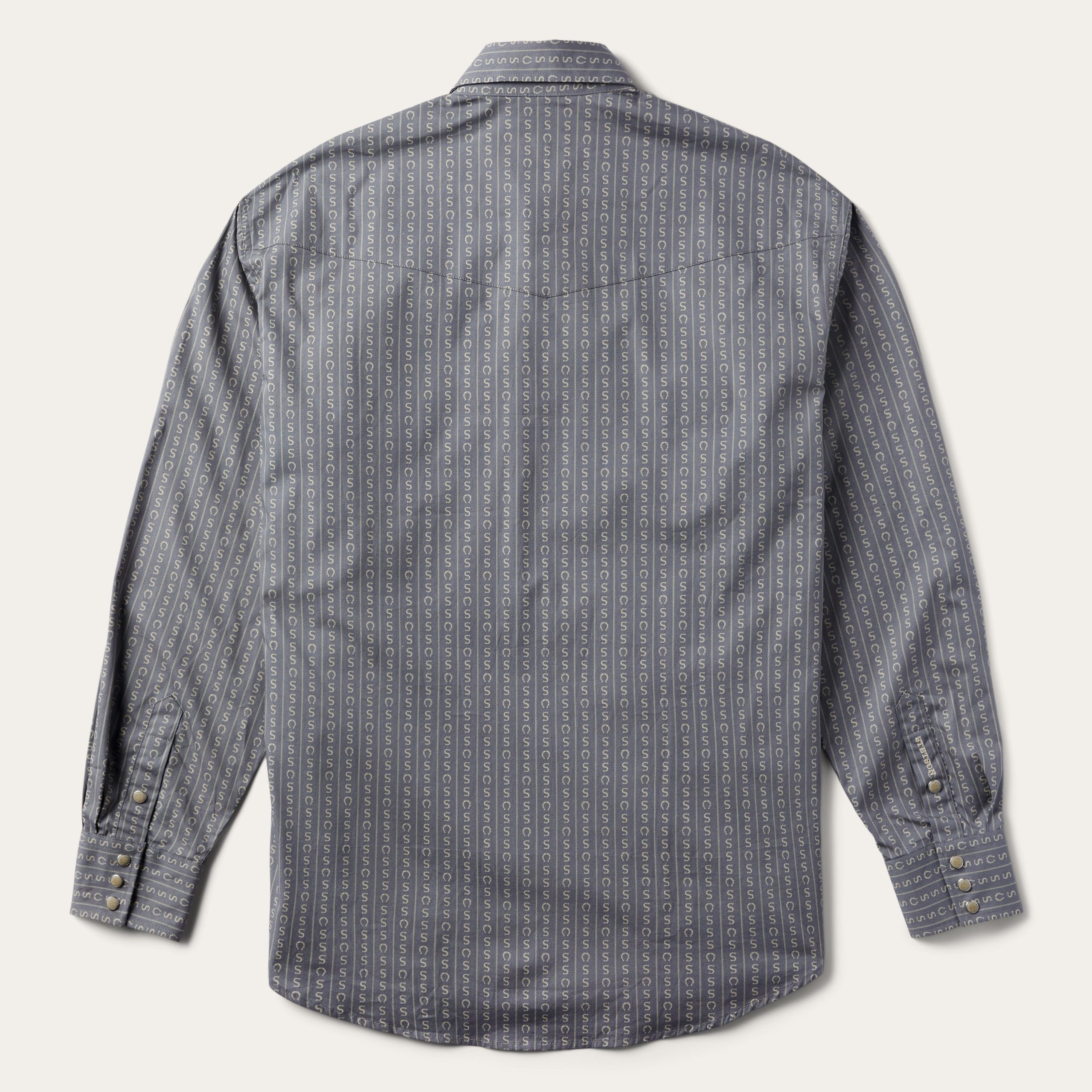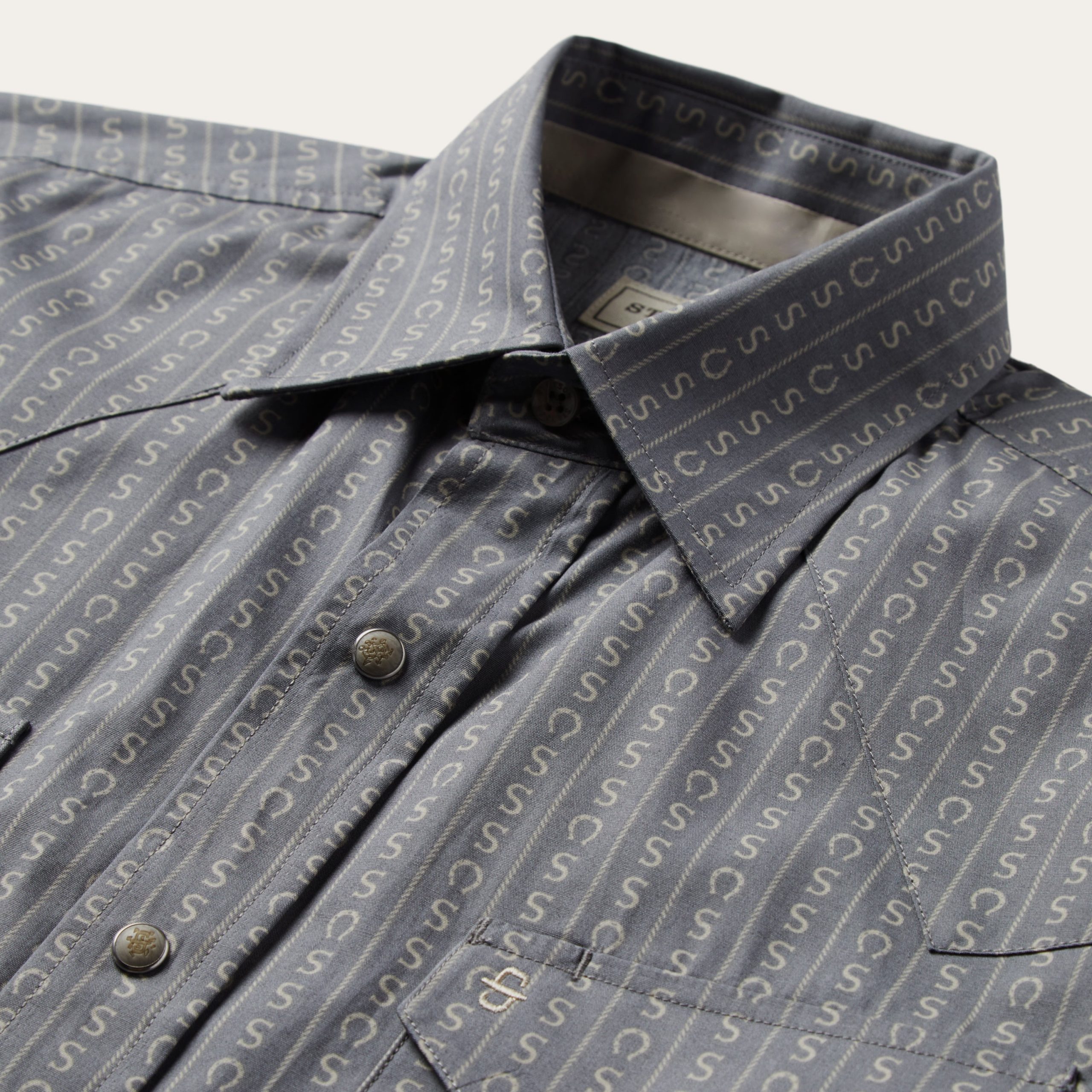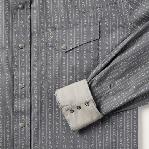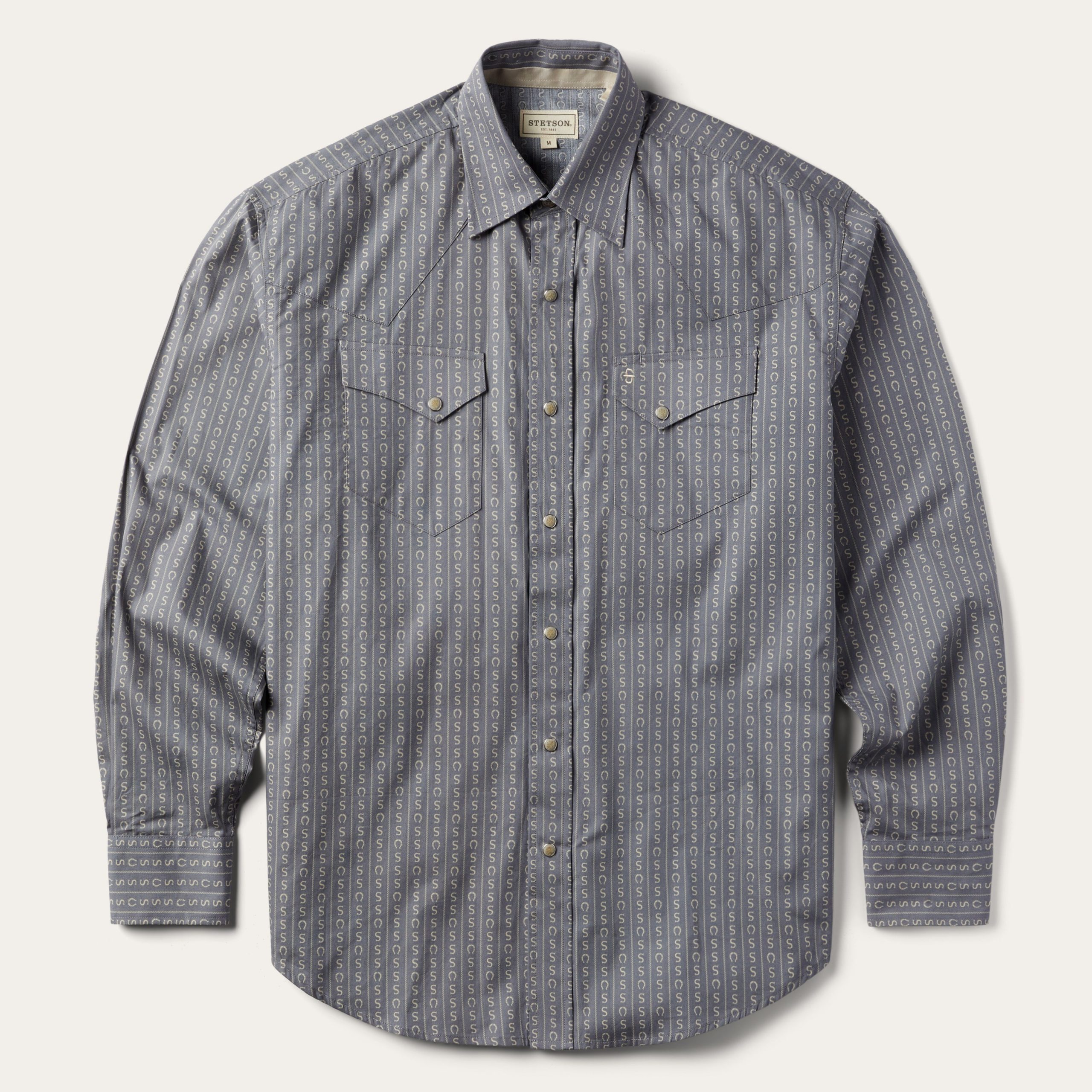 This grey snap-front shirt features our exclusive horseshoe stripe motif and further authentic Western details like one-point front and back yokes, one point chest pockets and a three-snap cuff. Subtly embossed Stetson logos on the chest pocket and sleeve placket along with striking interior paisley contrast trim add further style. Made from a crisp cotton poplin and cut in our classic original fit, it has the style, comfort and durability that are the hallmarks of our apparel…and maybe even a little extra luck.