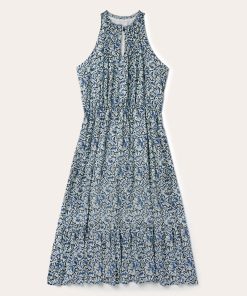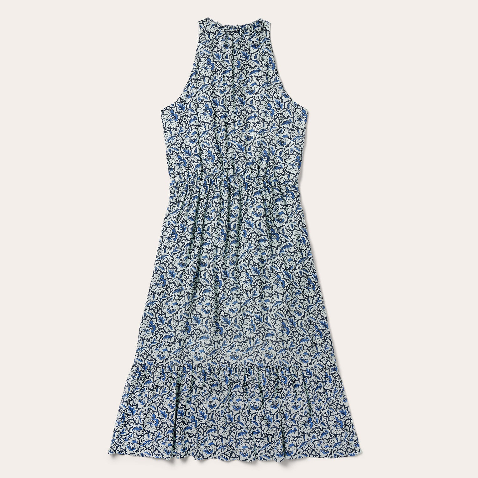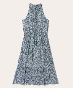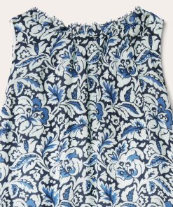This sleeveless prairie dress is crafted from soft, lightweight 100% rayon, featuring a richly colored allover Indigo Tapestry print. The classic, frontier-inspired style features a ruffled collar with self-covered button closure and keyhole, combined with an elastic waist and ruffled hemline. Fully lined for comfort and ease of movement, it has a relaxed elegance perfect for casual day or evening wear.