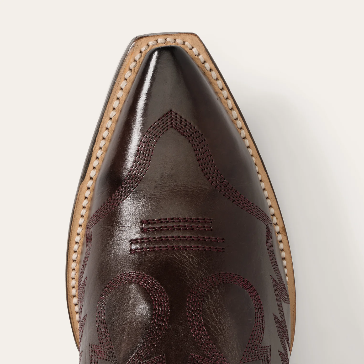 The Jess Boot features a leather vamp and 13” leather shaft with an eye-catching flame inlay. It has a snip toe—the ultimate statement-making style. Its quality construction includes single welt leather soles with brass nails and lemonwood pegs, hand-stacked leather heel, premium leather lining and a cushioned leather insole that ensures comfort and support in every step.