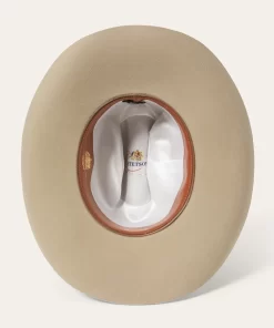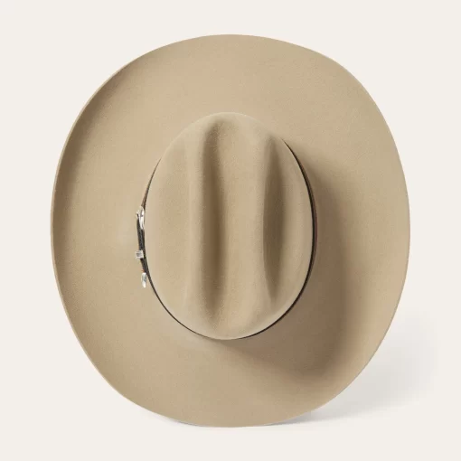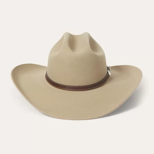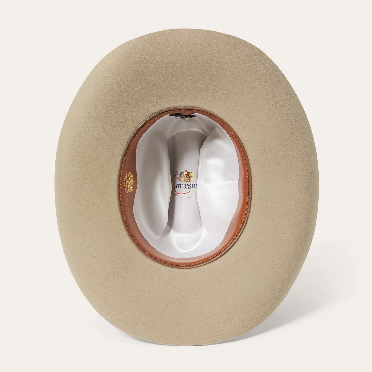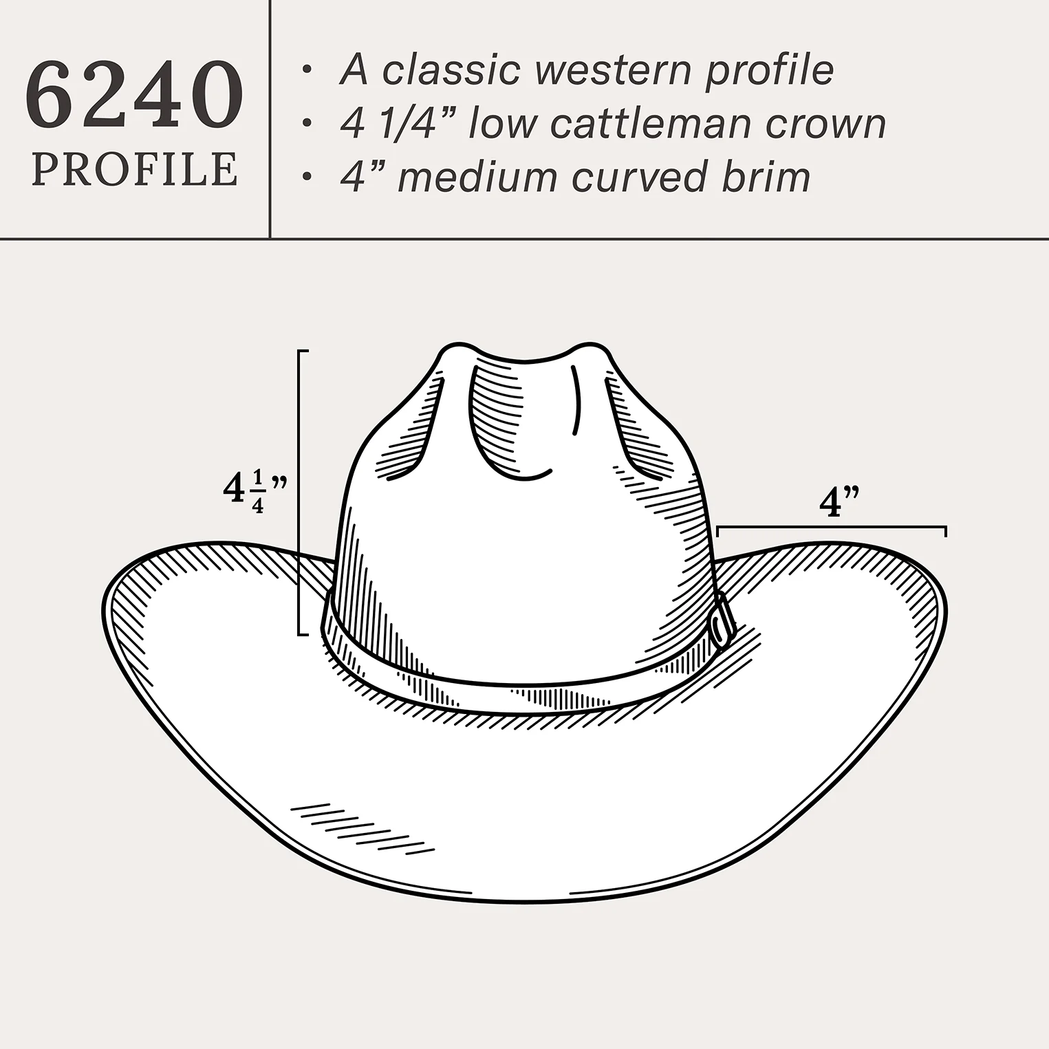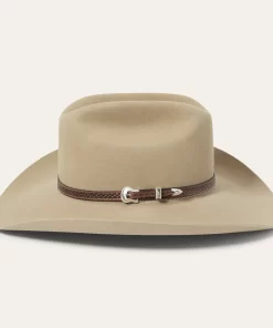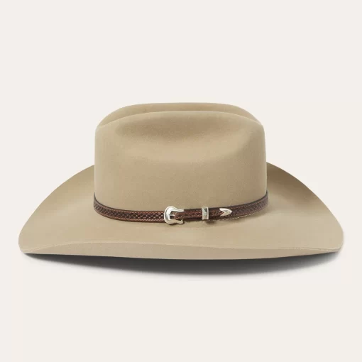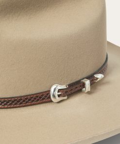 Handmade in the U.S.A. of durable, weather-resistant 4X quality wool, the Marshall 4X features a 4” brim and 4 ¼” cattleman crown finished with a rugged hand-tooled leather hat band and three-piece silver-tone buckle set. A genuine leather sweatband and full satin liner provide a secure and comfortable fit. Fit for long days on the range, our 4X quality wool hats are imbued with a Western spirit and fit for long days on the range. Includes an original Stetson hat box.