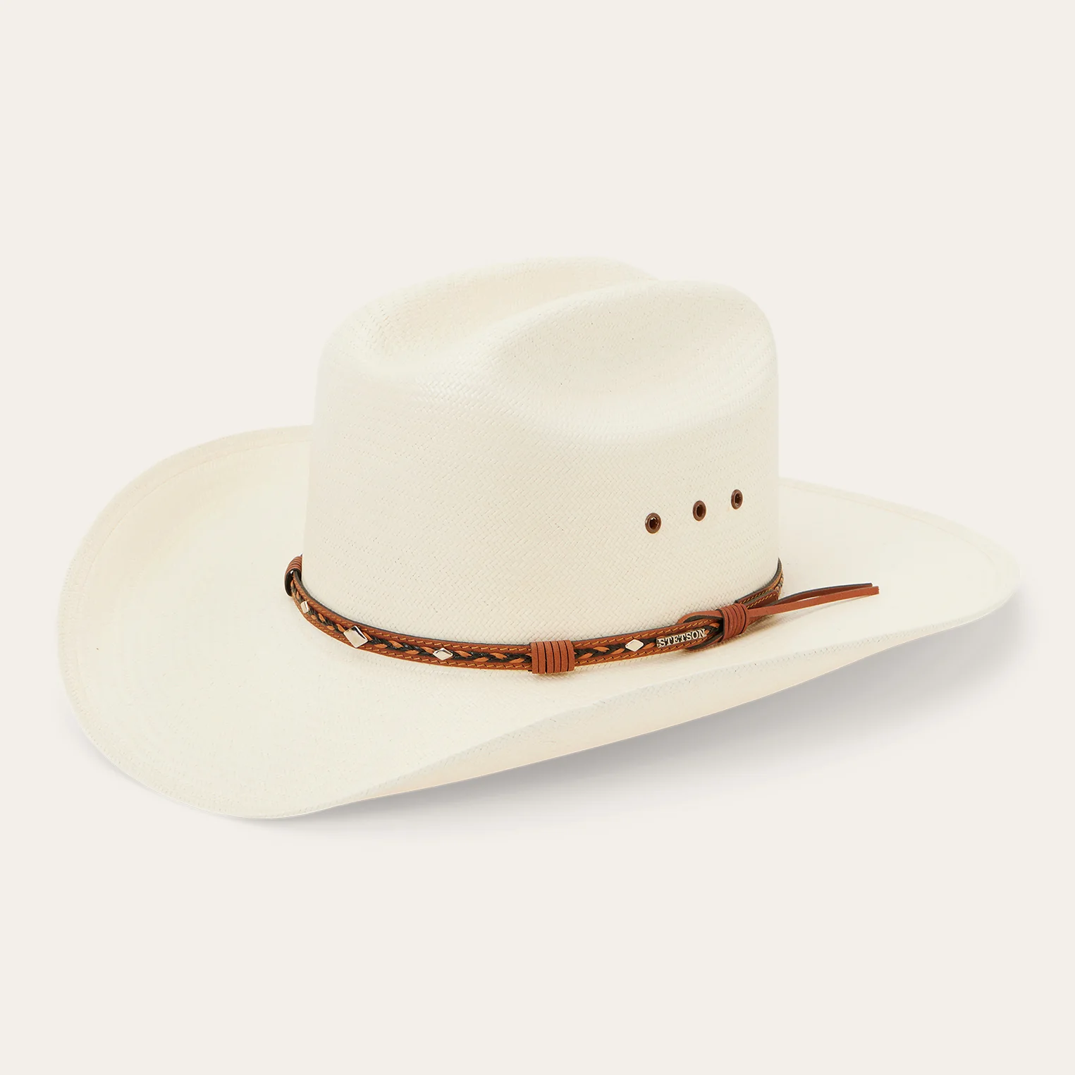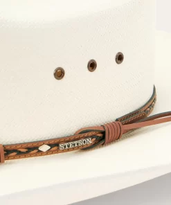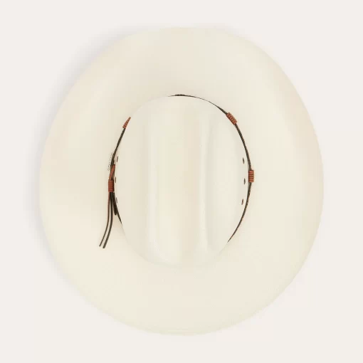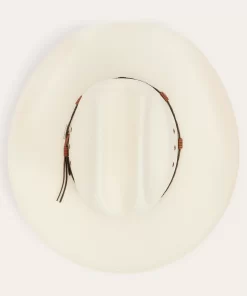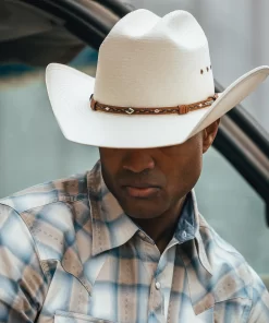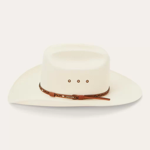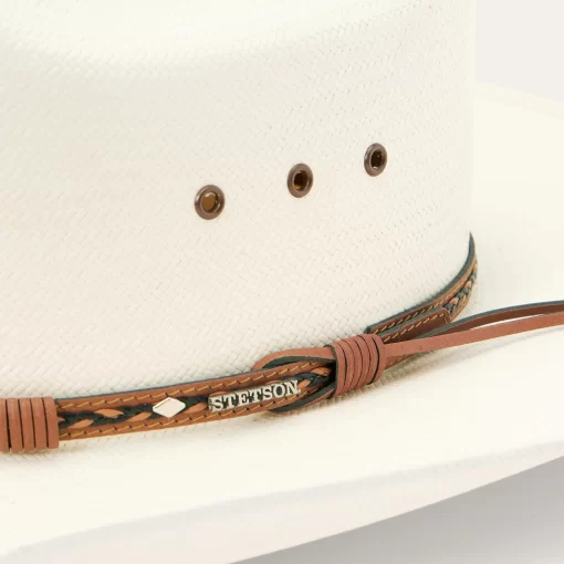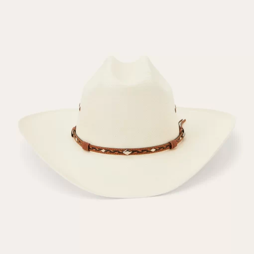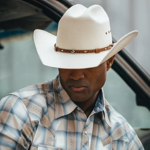 Handmade in the U.S.A. from high-quality shantung, the Ocala 8X Straw Cowboy Hat has a 4” brim and a 4 3/8” cattleman crown with eyelets for increased circulation and breathability. Its rugged Western style is enhanced by a two-tone braided leather hat band with diamond-shaped conchos and an absorbent DRI-LEX® sweatband ensures an all-day, comfortable fit.
