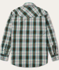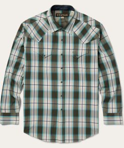 This snap front western shirt is crafted from 100% cotton and features a yarn-dyed olive ombre plaid with dobby stitch. It has asymmetrical snap-closure pockets with flaps, a spread collar,contrast denim inside trim and a one point back yoke.