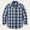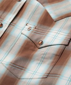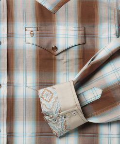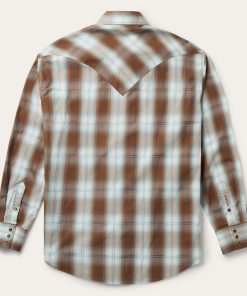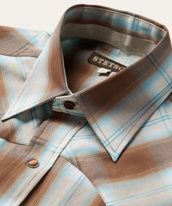 This Western shirt is crafted from a rich yarn dyed Sand Ombre plaid with an eye-catching satin stitch. It features a one-point ultra-deep curved back yoke, logo pearl snap front, and three snap cuffs. The front left pocket is adorned with the Stetson “S” logo and the right sleeve placket is embossed with “STETSON”. It has multi-colored inside trim fabrics and is made with 100% cotton for quality, breathability and comfort.