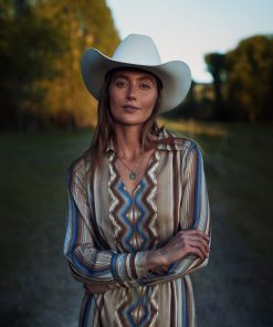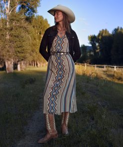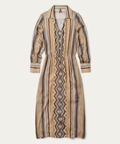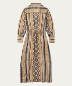 This stylish mid-length dress is crafted from 100% herringbone rayon, which has a smooth, silky feel and features our exclusive western-inspired Sand Serape print. It has a fold down collar with v-neckline, a straight back yoke, an elastic waist, partially-lined full skirt and deep, four-snap cuffs. Cut with an easy, flattering drape, the dress allows for all-day comfort and freedom of movement.