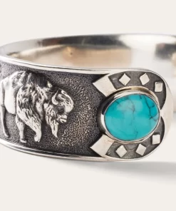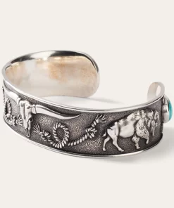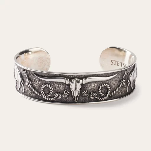 Classic Americana motifs decorate this Southwestern inspired cuff. The skull of a Longhorn sits front and center on the face of the cuff, flanked by knotted ropes, buffalo and horseshoes. Truly ornate, this cuff captures all the iconic elements of the rugged Southwest spirit. Wear this on its own, or layer with other pieces for a classic look.