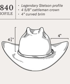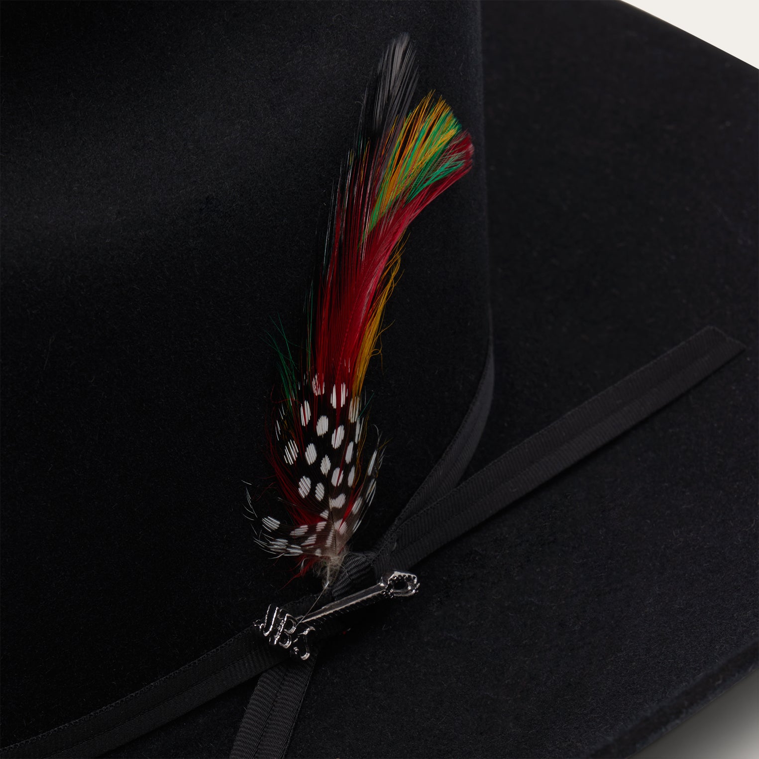 The Spartan 6X cowboy hat is crafted from 6X quality fur felt. Its authentic Western profile features a 4 5/8″ cattleman crown and 4” brim complimented by a two-ply ribbon hat band with feather detail, and JBS brand pin. A genuine leather sweatband and full satin liner provide all-day comfort and a superior fit. Handmade in the USA, with quality and style that will stand the test of time, the Spartan 6X ships with a Stetson hat box.