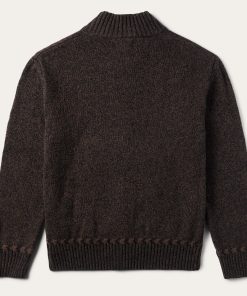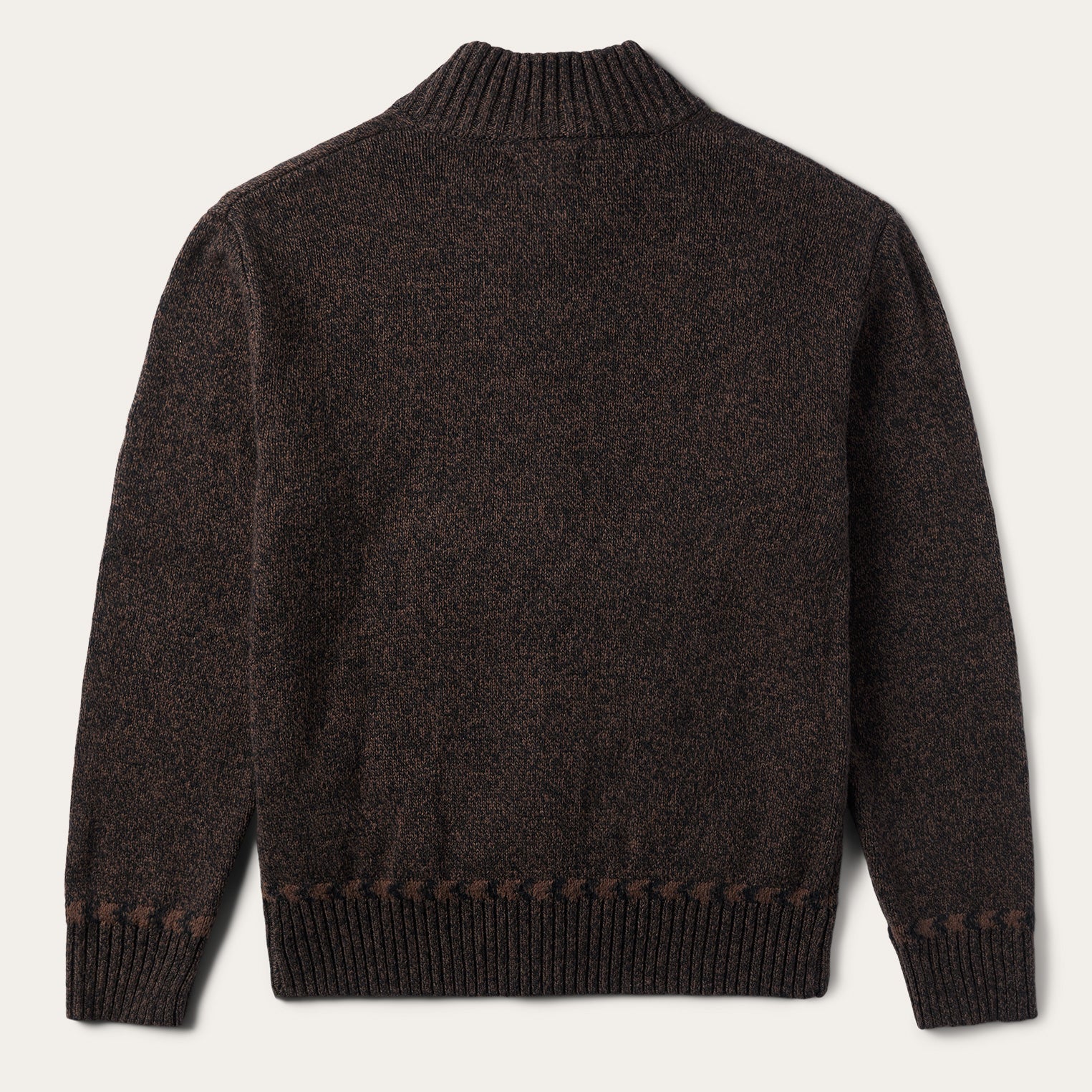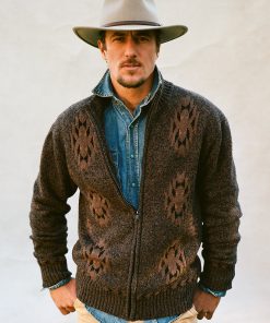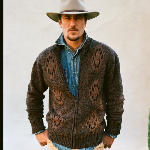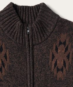 This rich chocolate zip-front cardigan features an exclusive vertical Aztec-inspired design on its front. Self-knitted collar, cuffs and waistband. Made from a wool blend, it provides warmth, comfort, and a dose of rugged style.